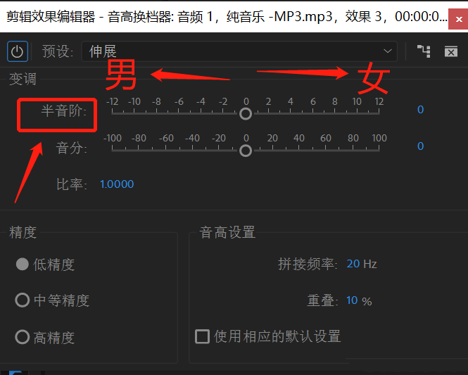 8、拖动在“半音阶”上的小圆点,向左为越来越粗犷的男声,向右为越来越细的女声。