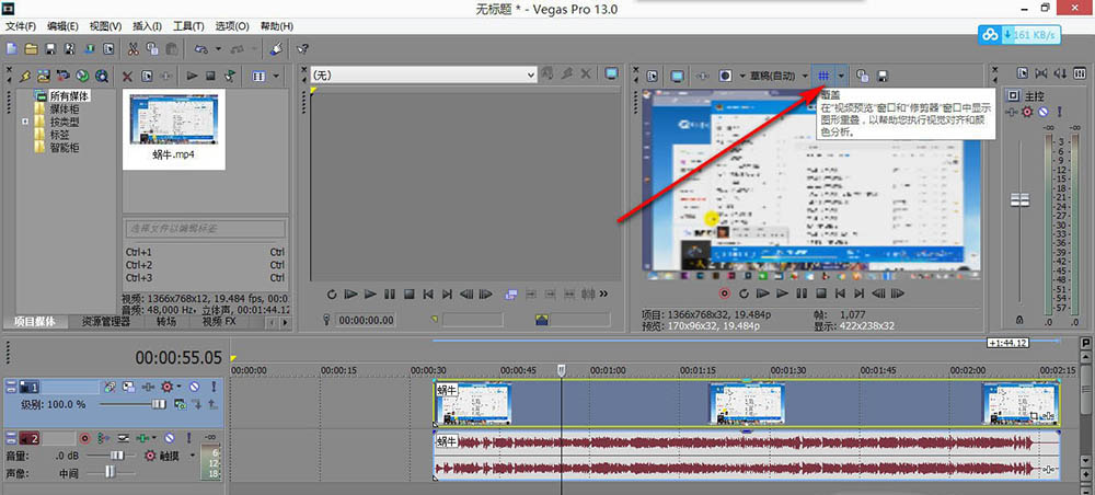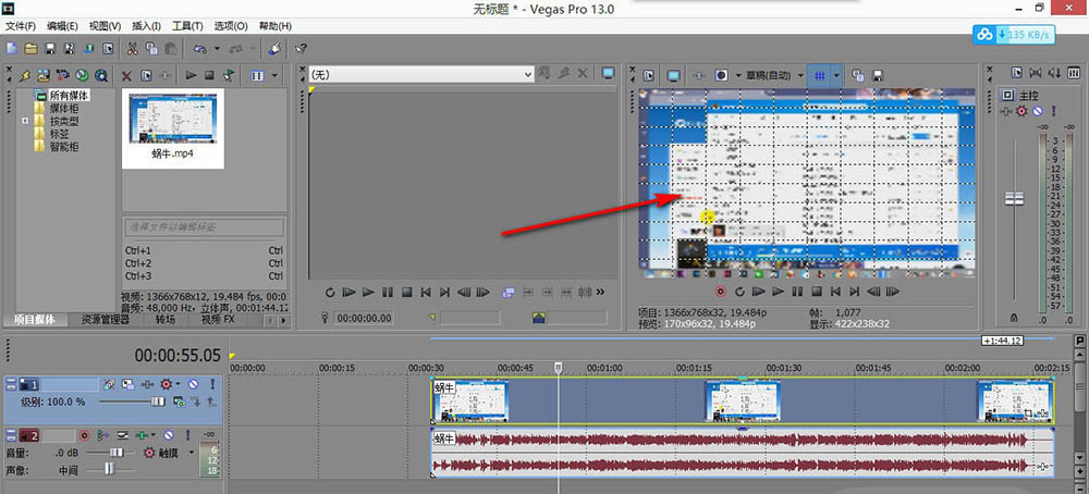 1、首先我们打开vegas,将视频素材拖入轨道中,可以看到上方当前显示的画面。