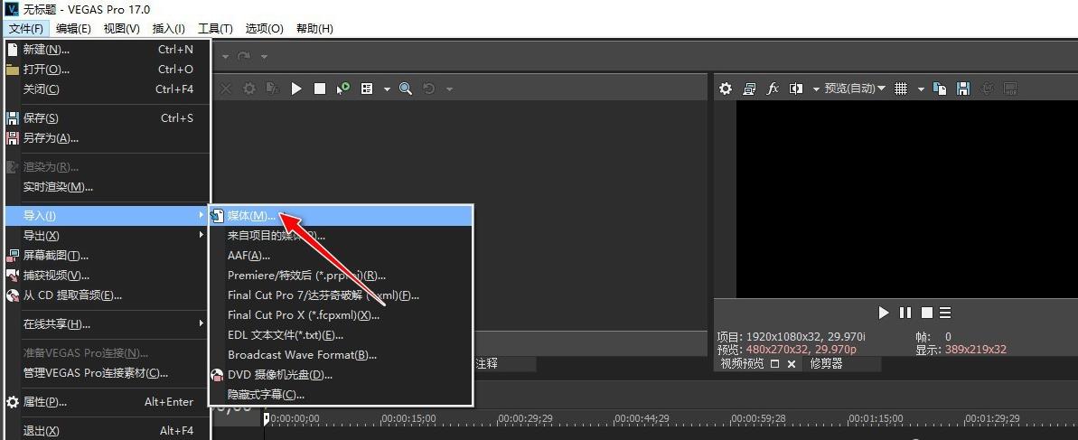 打开软件操作的主界面,选择"文件"->"导入"->"媒体"菜单。