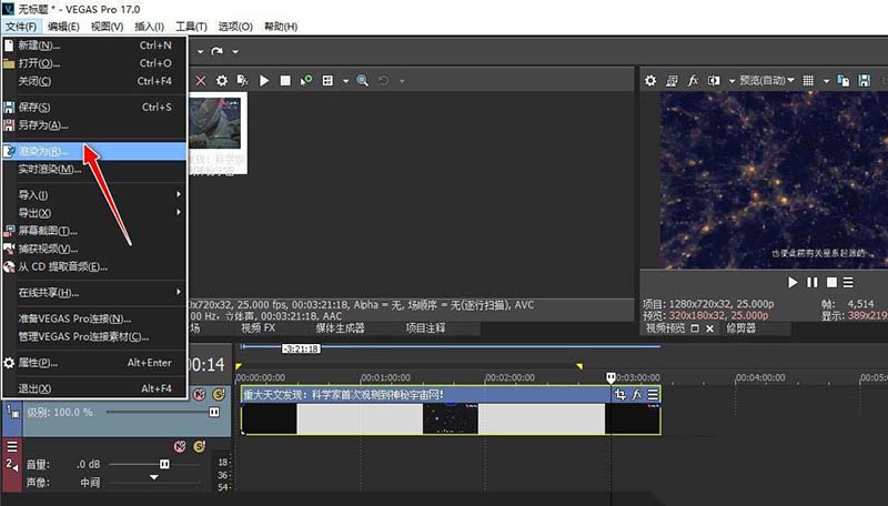 完成音频波形图组件的删除,选择"文件"->"渲染为"菜单,可将音频去除剪辑处理后的无声视频导出到电脑上。