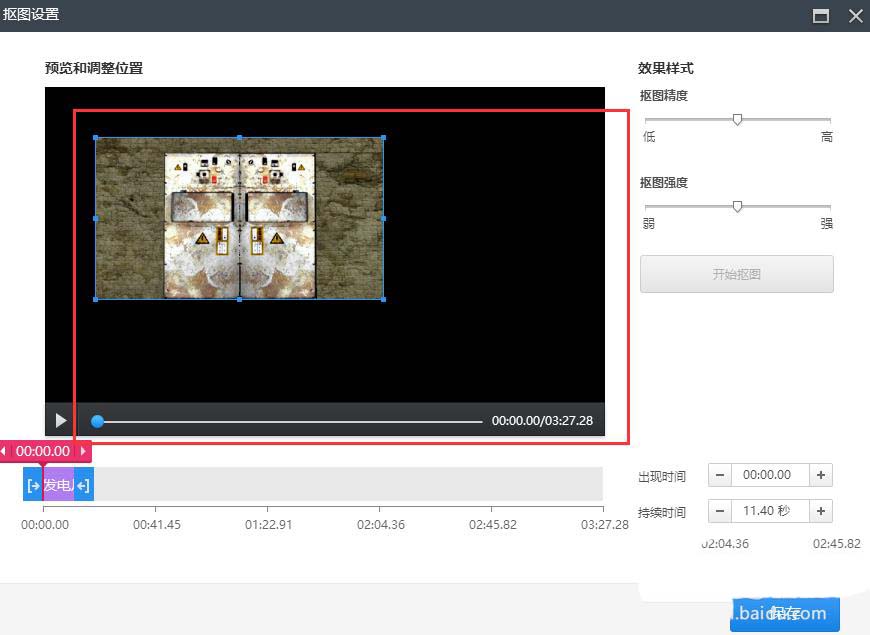4、打开抠图设置界面中调整抠图的大小、特效、持续等选项后单击【保存】选项