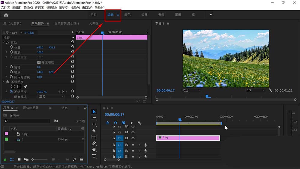 3、点击时间轴上的素材,然后鼠标移动到上部工具栏,点击左上角的效果控件。