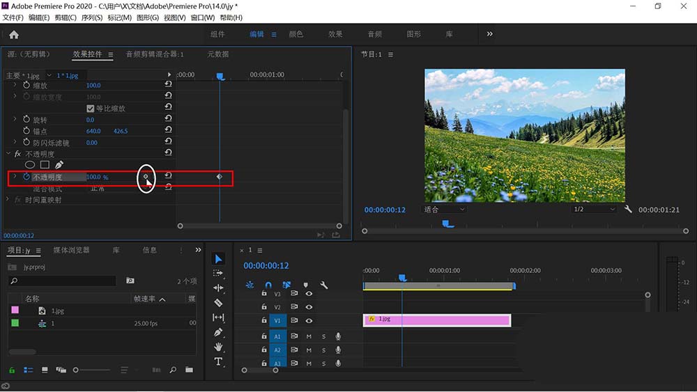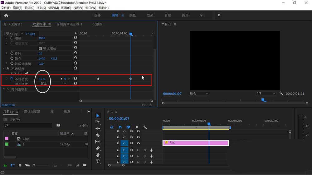 5、拖动关键帧窗口的时间滑块到合适的位置后,点击不透明度右边的关键帧设置图标也就是白圈所在的图案,出现第一个关键帧。