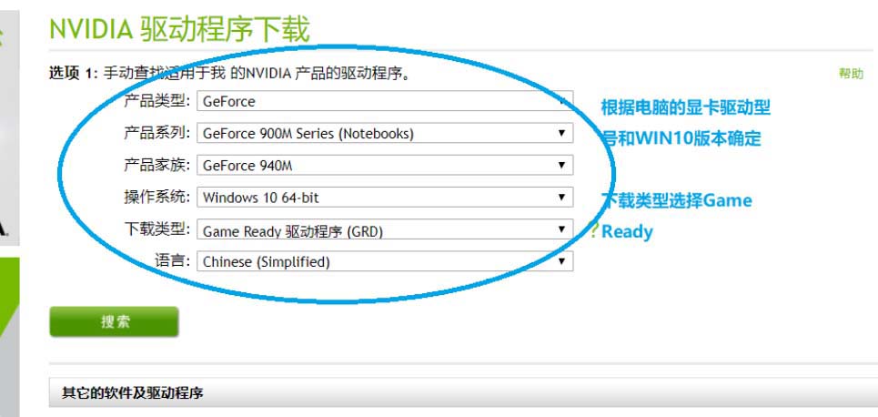在NVIDIA 驱动程序下载页面,根据我们电脑的显卡驱动型号和操作系统版本号在选择框里面选择对应的选择项。如本台电脑的显卡驱动的型号是"GeForce 920M",操作系统是WIN10 64位。