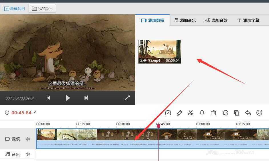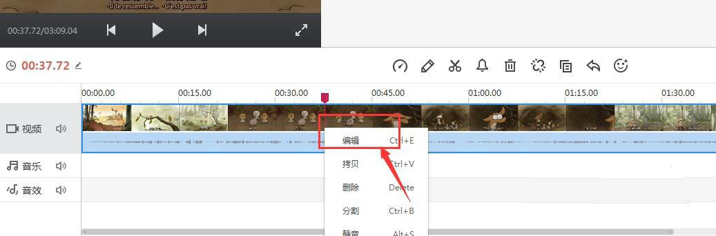 2、单击选中视频轴中的视频,在右键属性中选择【编辑】属性