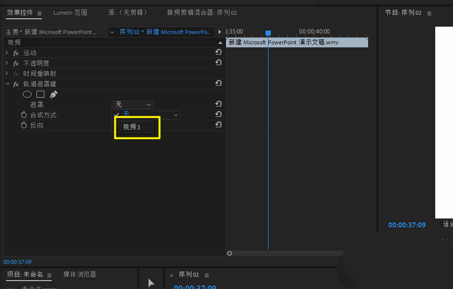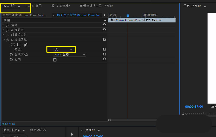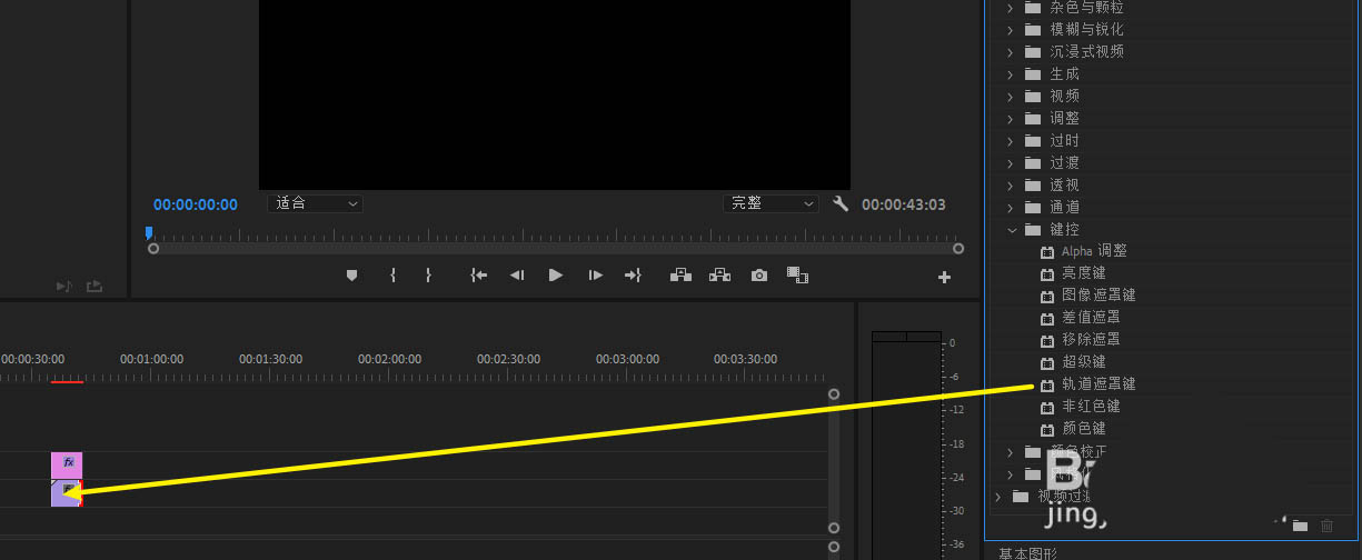 5、把轨道遮罩键拖入视频上,打开效果控件遮罩下。