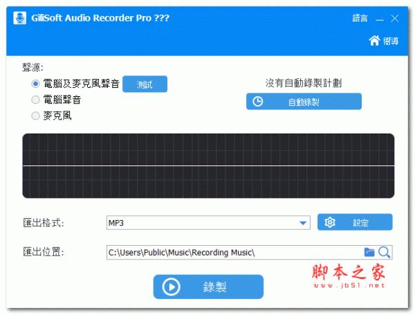 Gilisoft Audio Recorder pro是一款功能强大的专业音频录制工具,它可以帮助用户录制各种声音、音乐或者音频等,也可以录制麦克风里的声音、信号源以及来自互联网的流式音频,外部输入设备(例如CD,LP,音乐盒,电话线等)以及Winamp,Media Player等其他音频,十分全面。同时,通过该软件能够将电脑声音和麦克风录制到AAC,AC3,AIFF,AMR,AU,FLAC,M4A,M4B,M4R,MKA,MP2,MP3,OGG,RA,VOC,WAV、WMA等文件,并凭借内置的高级音频记录引擎,可轻松的为用户生成出高质量的录音,而且所录的音质可以媲美CD的音质,没有录制时间的限制,最后可以将录制好的文件制作成主流的音频格式,非常的强大。另外为了用户们可以更方便的使用该软件,小编特意为大家带来的是Gilisoft Audio Recorder pro汉化版,虽然是汉化成的是中文繁体字,但是也比直接用英文语言系统会更好点,欢迎有需要的用户们免费下载体验。