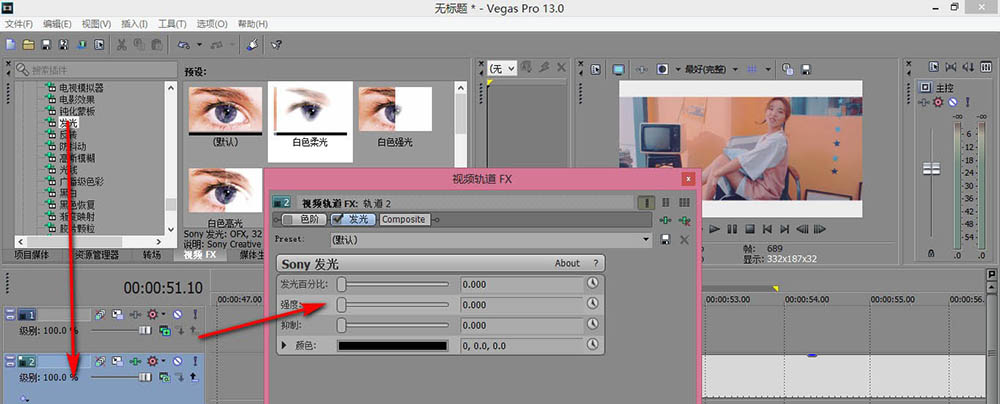 1、下面要在两个素材中间添加一个闪白效果,在视频事件FX选项里面找到发光的特效。