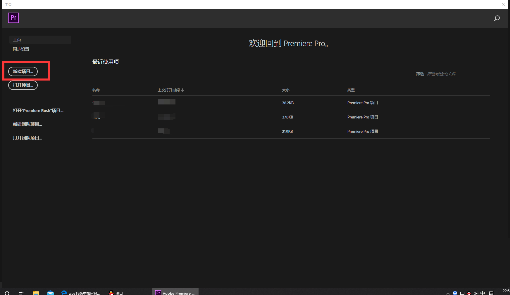 2、进入pr2019主页面后,我们点击上方的”新建项目“按钮