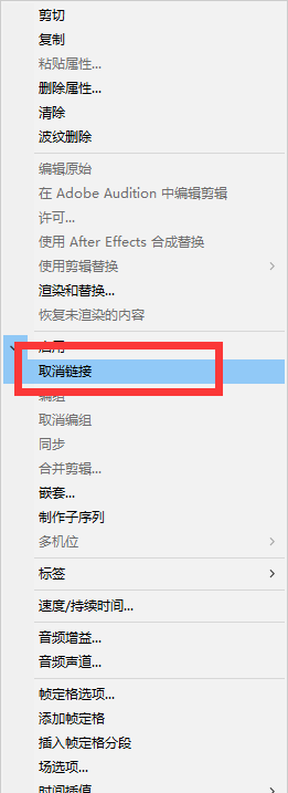 5、最后我们选中已经连接的视频和音频,然后我们右键在弹出的菜单中选择取消连接,就可以将视频和音频的连接取消了