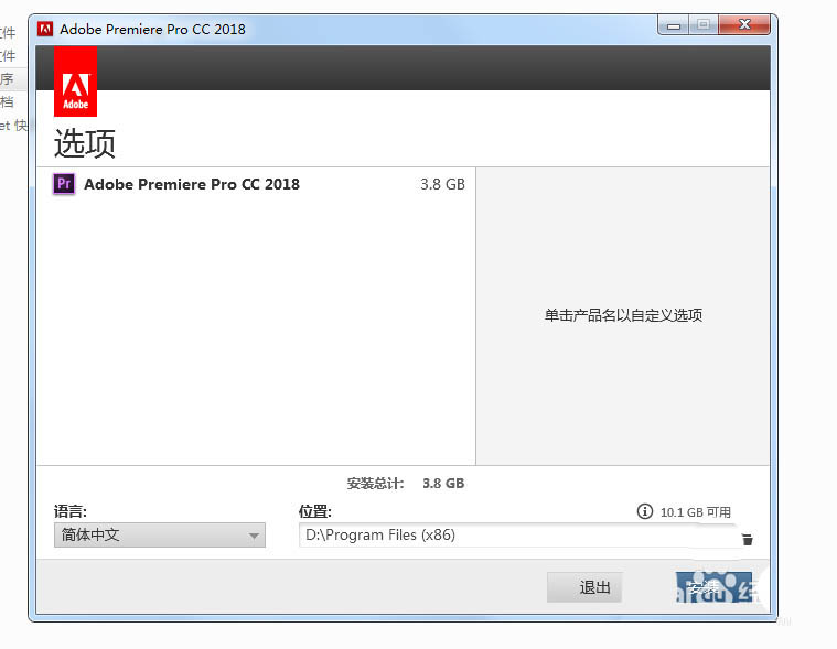 2、再次打开Adobe Premiere Pro CC 2018点击安装程序,等待安装程序初化以后,选择安装程序的路径,一般情况我不会安装在系统盘,这点很重要,因为系统盘空间本来就小,可以安装到其它盘里面,如D盘(如图所示)