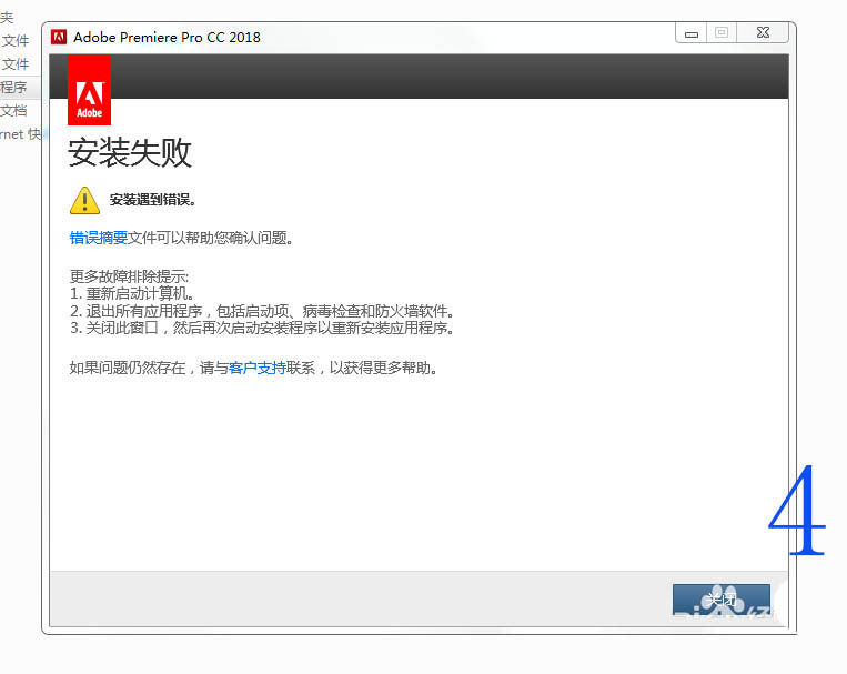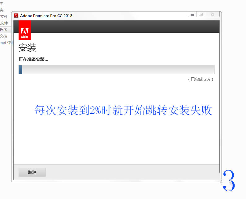 最近拍了好多视频,想用Adobe Premiere 来剪辑,然后就买了Adobe Premiere Procc 2018,但是安装Adobe Premiere Pro CC 2018的时候老是显示安装失败,每次安装Adobe Premiere cc时,安装到2%就突然停止并马上跳转到安装失败窗口,变更安装路径不可以,使用默认的安装路径也不可以。
