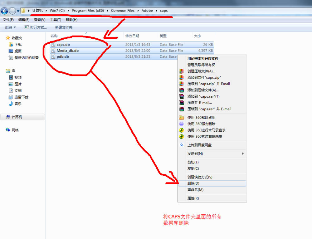 1、首先准备好Adobe Premiere Pro CC 2018 安装程序,然后找到C:\Program Files (x86)\Common Files\Adobe\caps下的文件,一般都是以.db为扩展名文件(查看文件扩展名的方法(以WIN7为例):打开菜单栏中的“工具”--“文件夹选项”--“查看”在“高级设置”中找到“隐藏已知文件类型的扩展名”,把这个选项前面的勾去掉就行了),我这打开后有三个数据库文件,分别为caps.db、Media_db.db和pdb.db,直接删除掉就行,对你的其它Adobe软件没有任何影响,当然,如果你觉得怕就可以先复制一份,再删除即可