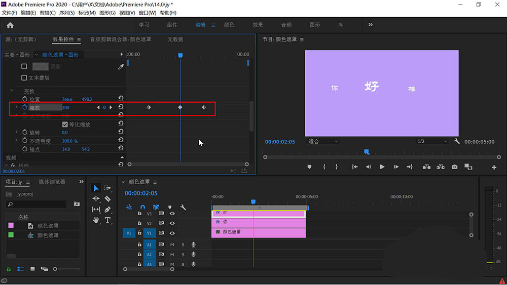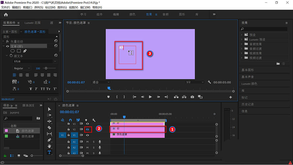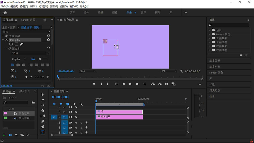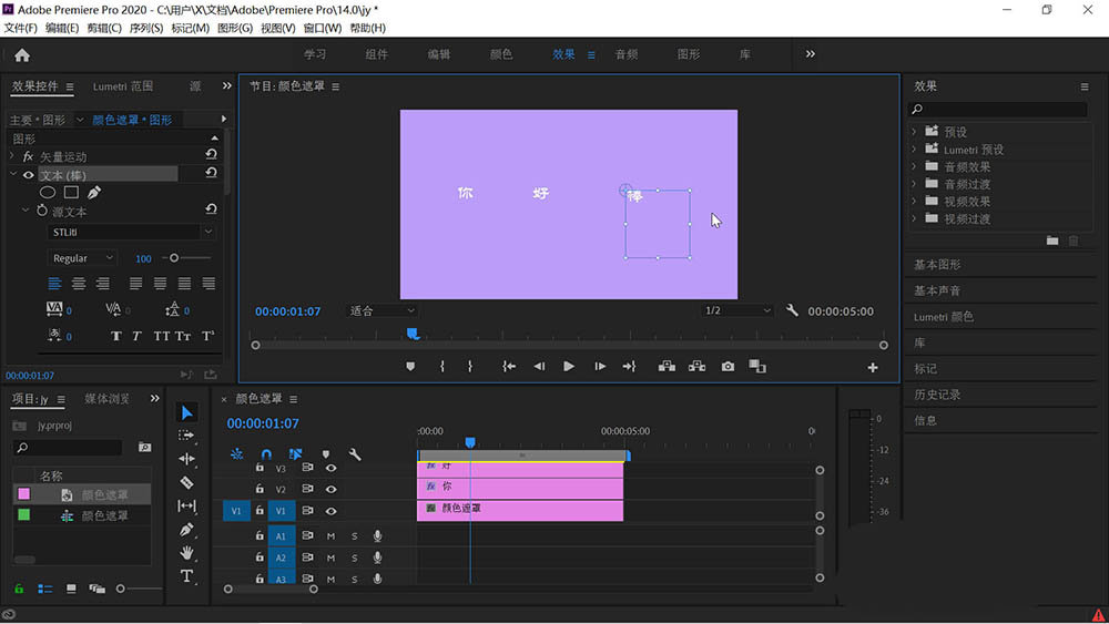 2、点击时间轴左侧的T型文字工具后回到右边的视频预览区,拖动一个文字输入框后输入一个文字,如下图的“你”,在时间轴上选中该图层后在左边的效果控件下修改文字的格式。