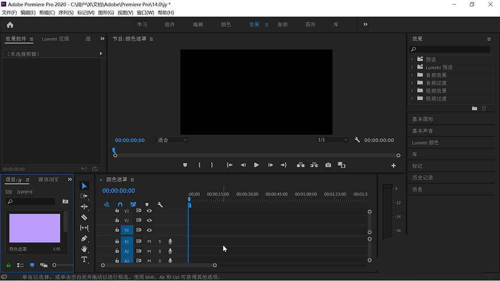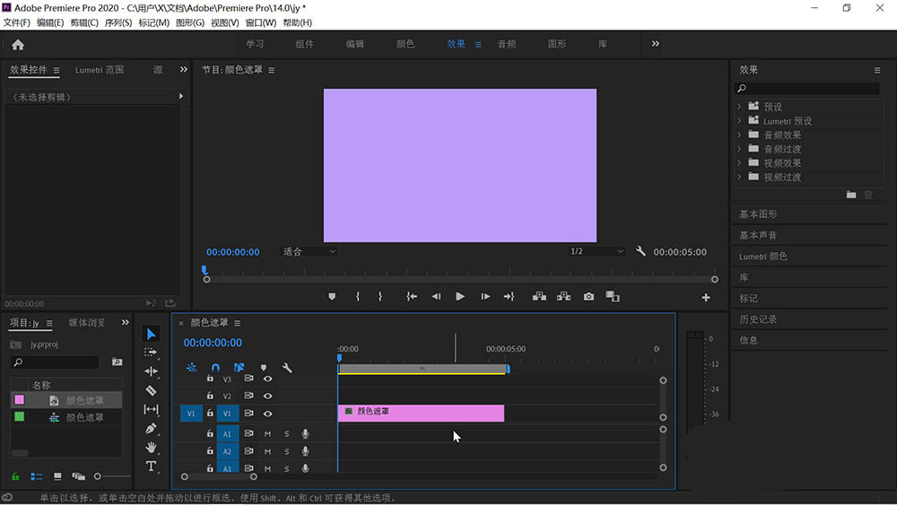 1、打开pr,新建一个浅色的颜色遮罩并拖入到右边的时间轴上。
