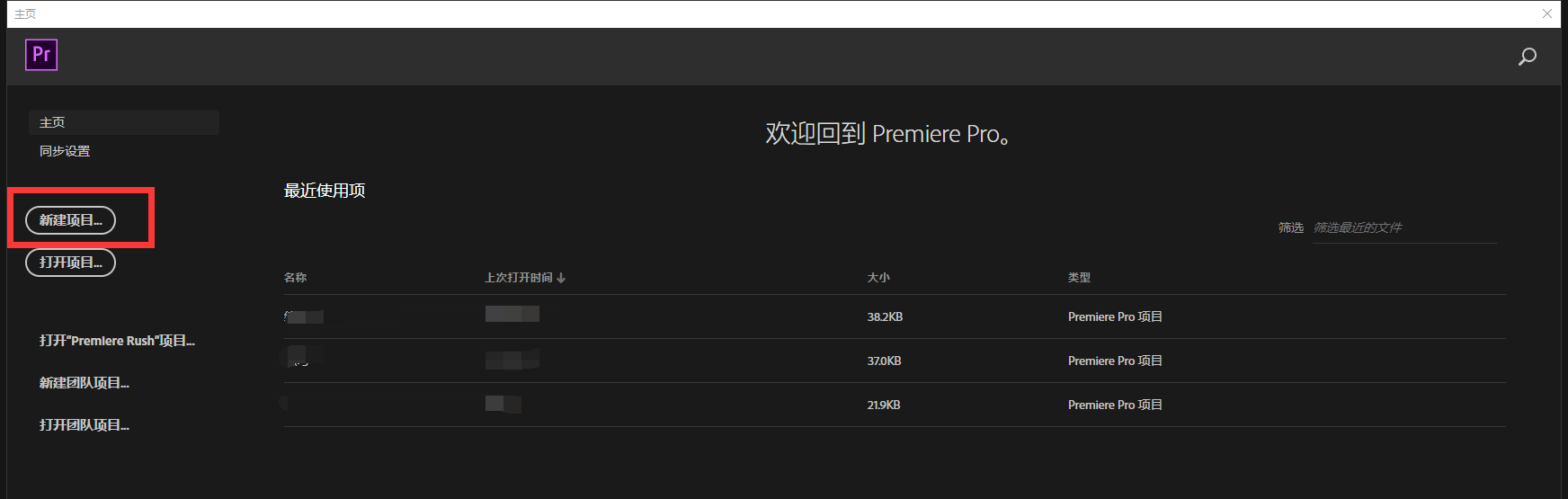 2、进入pr2019主页面后,我们点击上方的”新建项目“按钮