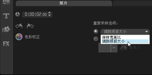 二、展开选项面板,在“照片”选项卡中设置“区间”参数为2秒,在“重新采样选项”中选择“调到项目大小”选项。