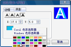 五、单击“边框阴影透明度”按钮,弹出对话框,切换至“阴影”选项卡,单击“突起阴影”按钮,设置“X”参数为17.0,“Y”参数为5.0,并单击“突起阴影色彩”颜色块,选择“蓝色”,然后单击“确定”按钮完成设置。