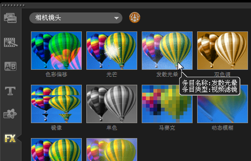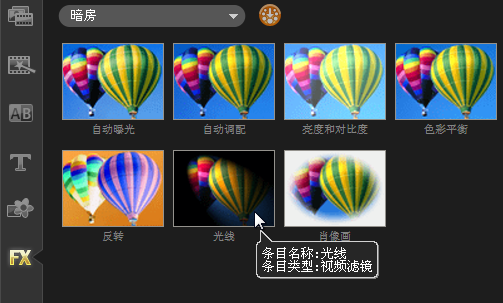 六、单击“滤镜”按钮,进入“滤镜”素材库,在“暗房”中选中“光线”滤镜,并将其拖到标题轨的素材中。