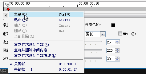 十、设置“发散”参数为30,在第一个关键帧上单击鼠标右键,制作“复制”命令。
