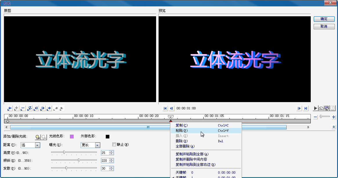 十一、将飞梭栏拖动到1秒的位置,创建新的关键帧,单击鼠标右键,执行“粘贴”命令。