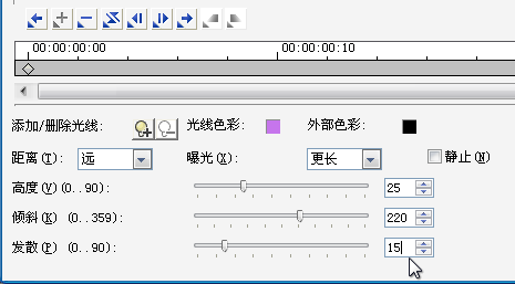 八、弹出“光线”对话框,在“距离”下拉列表中选择“远”,在“曝光”下拉列表中选择“更长”。