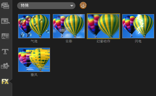 5、单击“滤镜”按钮,进入“滤镜”素材库,在“特殊”中选中“幻影动作”滤镜,并将其拖到标题轨的素材中。