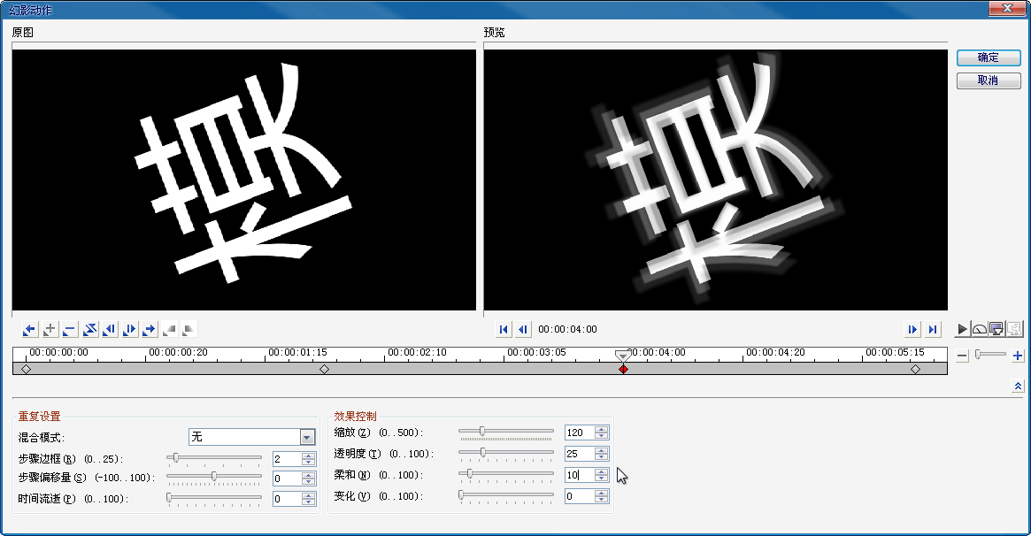 9、将飞梭拖动到4秒的位置,创建新的关键帧,设置“步骤边框”参数为2,“透明度”为25,“柔和”为10。