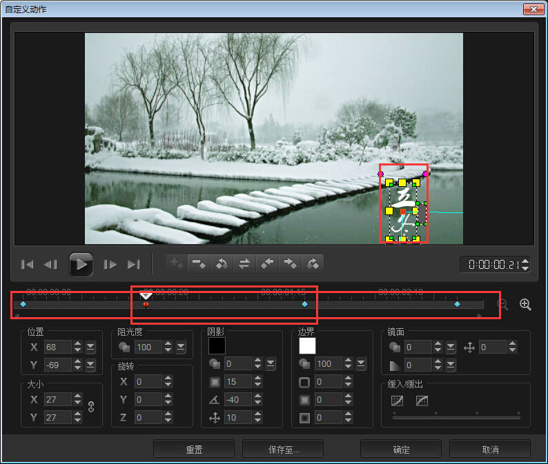 会声会影标题动画中的除了缩放和下降,其他的效果都可以设置暂停,暂停的时间可以选择:短,中,长或自定义,通过移动左侧预览框下的滑块来调整暂停的时间。