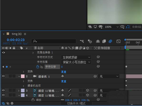 4、给字符位移打上关键帧,起始帧设置一个大于100的数值。