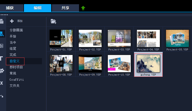 六、操作完成后,即使项目素材库打开,用户可以在自定义素材库中看到保存的模板。