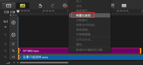 3、然后同时选中声音轨和音乐轨上的音乐,右击选择等量化音频,就能听到视频的声音和背景音乐的声音同样高了。