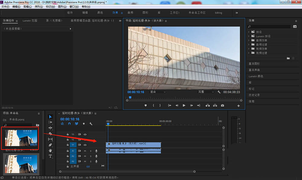 3、长按鼠标左键,将左侧导入的视频素材拖动至右侧的时间轴上。
