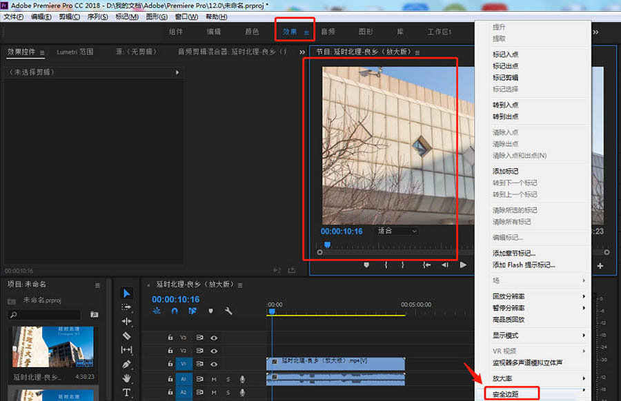 4、点击顶部工具栏中的效果,选中监视器窗口,在右键弹出的窗口中点击“安全边距”。
