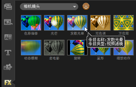 十一、单击“滤镜”按钮,进入“滤镜”素材库,在“相机镜头”中选择“发散光晕”滤镜,将其拖到标题轨素材中。