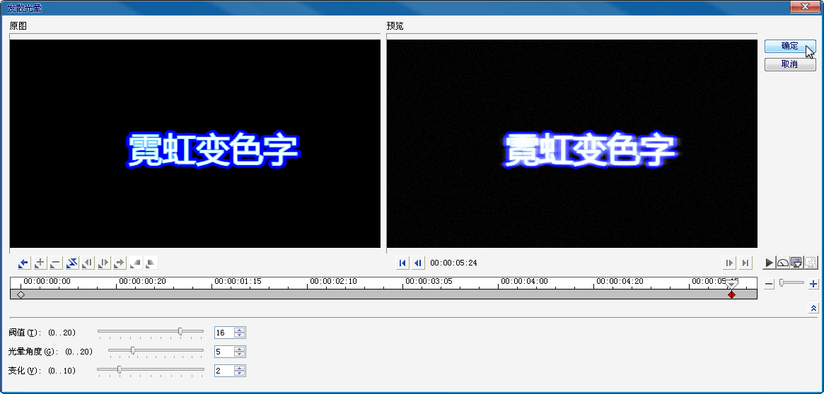 十三、在弹出的对话框中第一个关键帧,设置“光晕角度”参数为6,选中第二个关键帧,设置“光晕角度”参数为5,然后单击确定按钮。