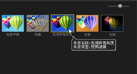 十四、进入“滤镜”素材库,在“暗房”中选中“色调和饱和度”滤镜,并将其拖动到标题轨中的素材上。
