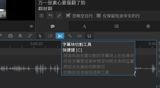 5、最后我们点击主页面上面的“快速拖拽工具”就可以将字幕和视频进行匹配,如果我们要将字幕分为两段的话。点击上方的“字幕切割工具”点击要切割的地方即可