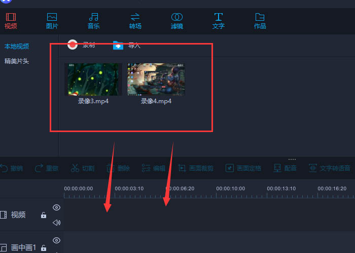 2、此时在编辑视频的界面中导入两个视频素材后再把它们拖到“视频的轨道上”