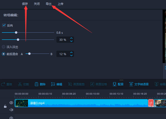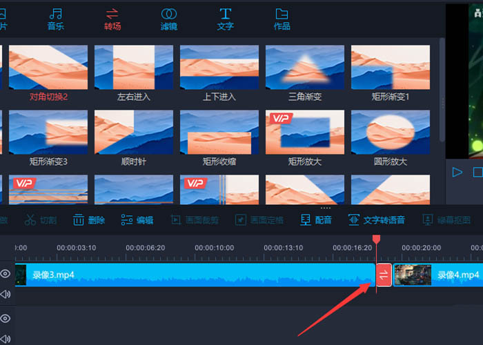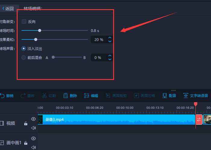 6、单击这转场效果会对转场功能进行设置,比如转场的快慢、转场声音等