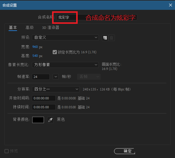 1、打开AE.新建一个项目.新建一个合成,命名为炫彩字。