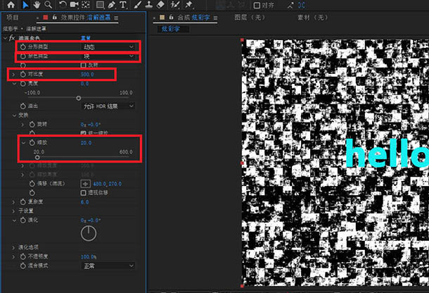 4、为溶解遮罩添加湍流杂色效果,并将该效果的分形类型设置为"动态",杂色类型设置为"块",对比度设置为500,变换中的缩放设置为10~20,使其成为马赛克形状。