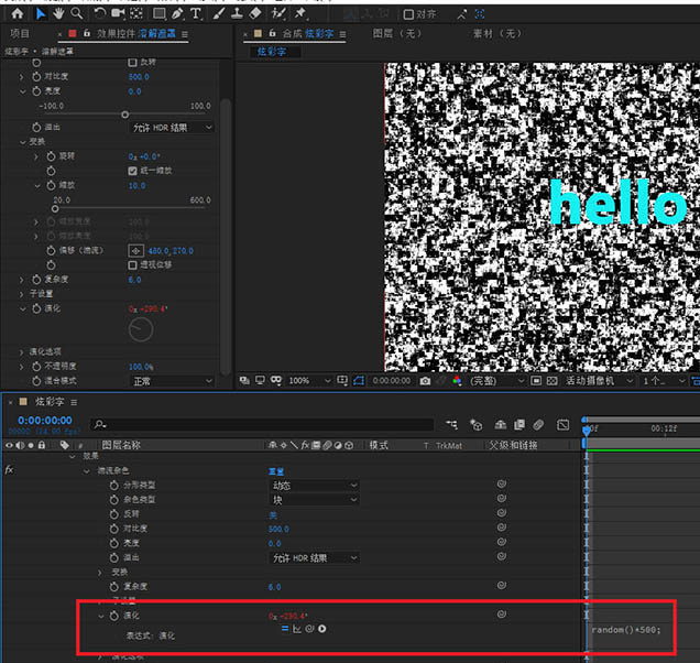 5、设置溶解遮罩"湍流杂色"效果的演化属性表达式为"random()*500;",使马赛克无序动起来,形成早期黑白电视的雪花噪点。