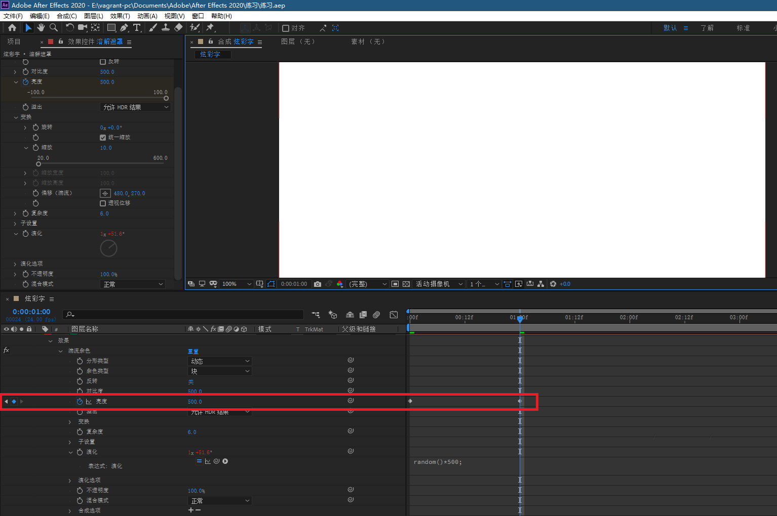 6、给溶解遮罩"湍流杂色"效果的亮度属性添加关键帧,并在0s处设置亮度值为-500,1s处设置亮度值为500,使溶解遮罩从暗到亮显示。