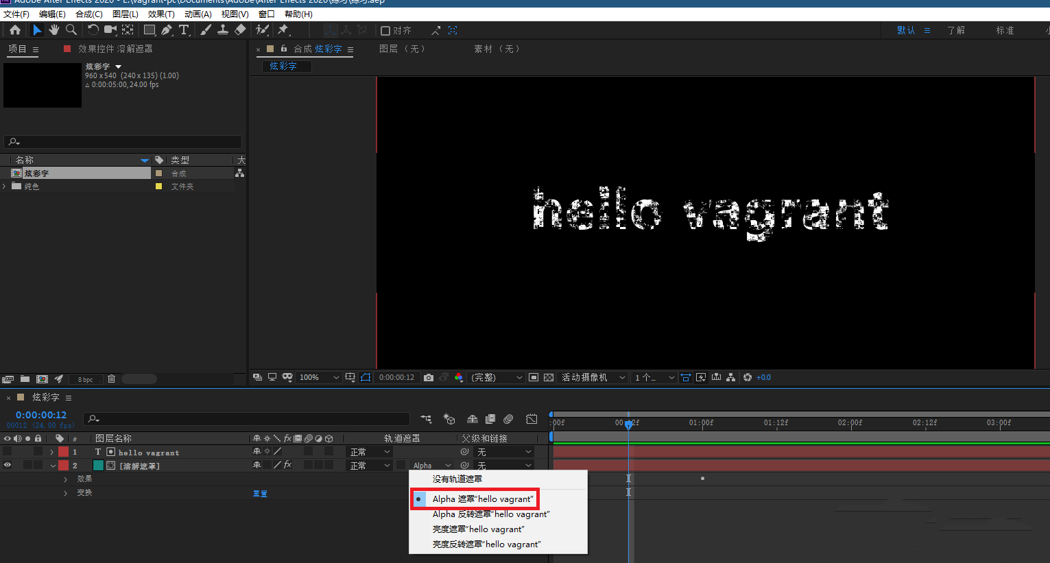 7、为"溶解遮罩"图层添加"alpha轨道遮罩",遮罩层为文字图层。此时文字渐显效果完成。