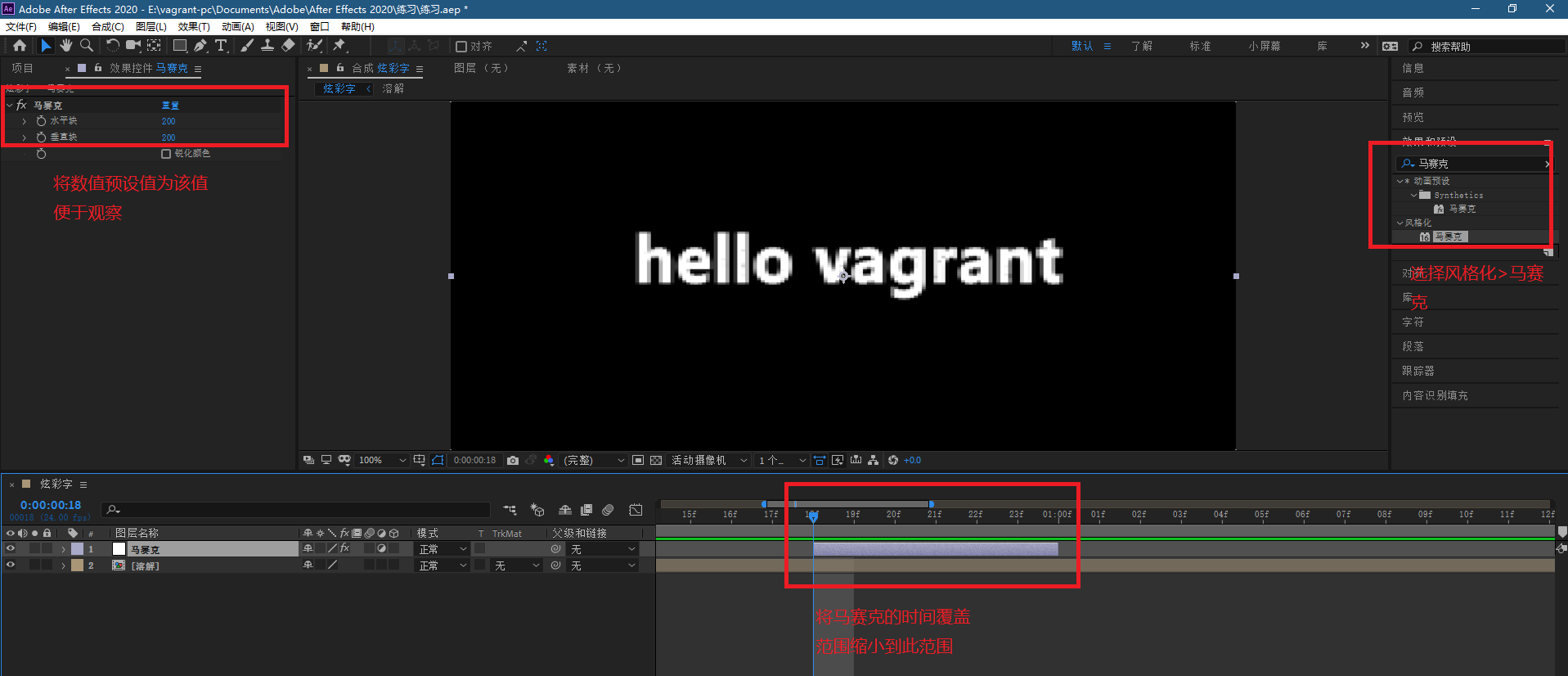 3、为马赛克图层添加"风格化>马赛克"效果。并将马赛克水平块和垂直块数值都设置为200,然后将马赛克图层覆盖的时间段设置为18~24帧之间。