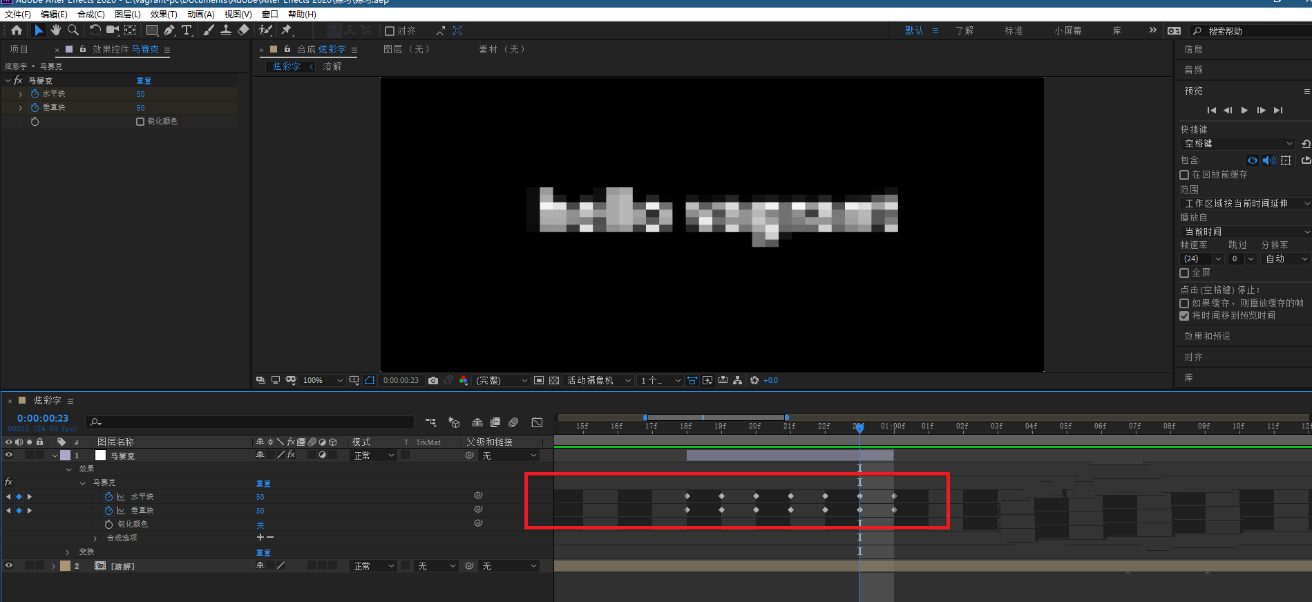 4、为马赛克的水平块和垂直块打上关键帧,然后从18~24帧开始每一帧都打上关键帧,然后数值从200递减到20,制造处一种信号短暂丢失后又恢复的效果。