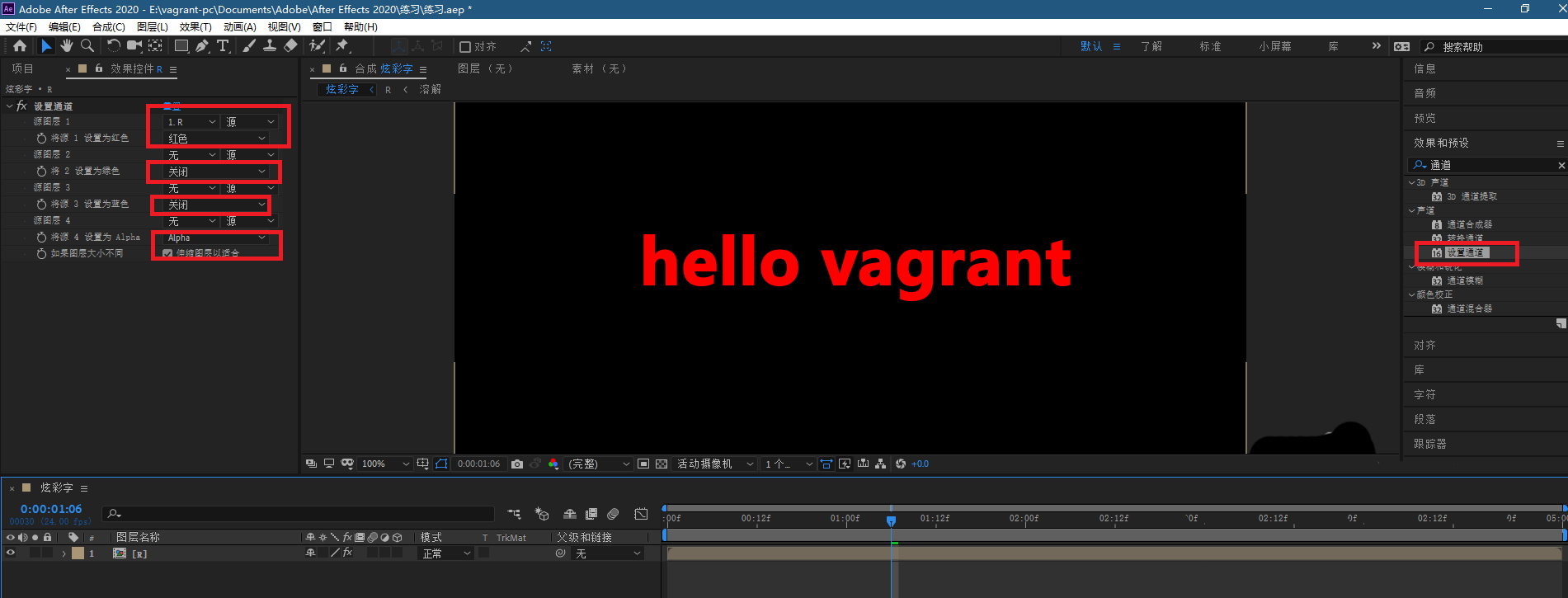 2、为R添加"设置通道"效果。通道1选择R,红色。通道2和通道3关闭,保留通道4。
