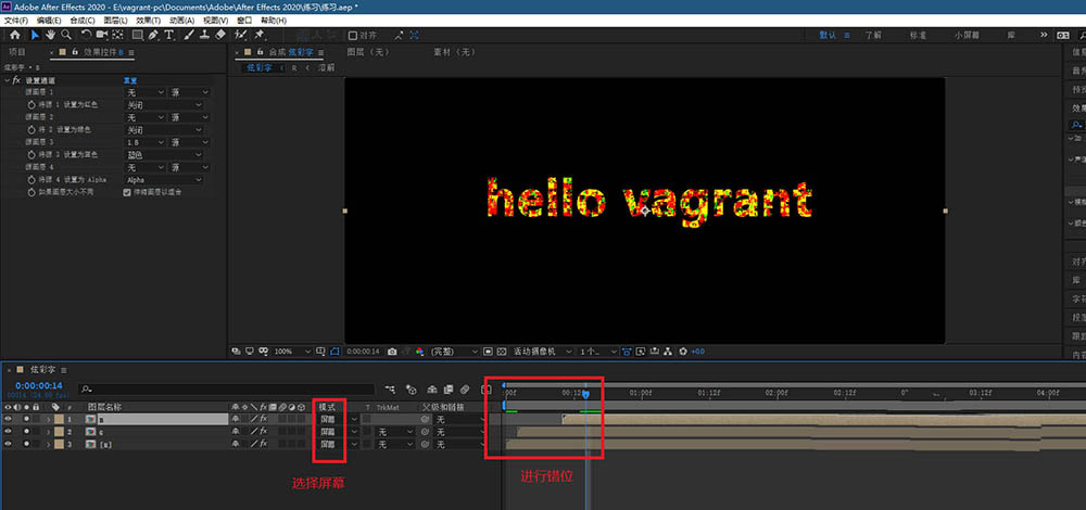 4、设置R,G,B合成的模式为屏幕。该种模式可以使每个图层的颜色进行混合。然后将R,G,B三个图层进行一定的错位,使其能够产生不同的颜色。