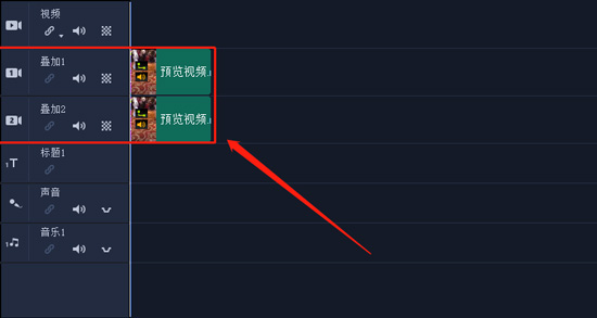 2、复制叠加轨道1视频放在叠加轨道2上,位置保持一致。